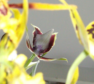 Yesterday I came home to find the Zygo Everspring 'Noland Van Dallen' AM/AOS orchid had blown over in the crazy wind we have had for a few days. This normally would not be that big of a disaster but this plant has 2 spike just about to bloom. One of the spikes broke. Not off completely it is still attached just limp. So my friends on OrchidGeeks gave me advice on trying to save it. So I took some florist tape and a little splint and wrapped the spike. Then I put a little stake in the pot to help support it. The stake is very disappointing because the spikes were holding themselves up very nicely. Oh Well. So as of tonight the 1st bloom has opened on the spike that is not broken.